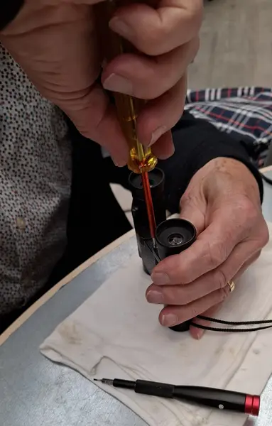 Op deze ochtend kwam een bezoekster met een kleine maar fijne verrekijker aan. Hij zat wat los maar ze kon de schroefjes zelf niet vastzetten. Dus of een ervaren vrijwilliger er even naar kon kijken. De schroefjes zaten onder twee kleine zwarte dopjes, die er ook maar moeilijk vanaf wilde komen.